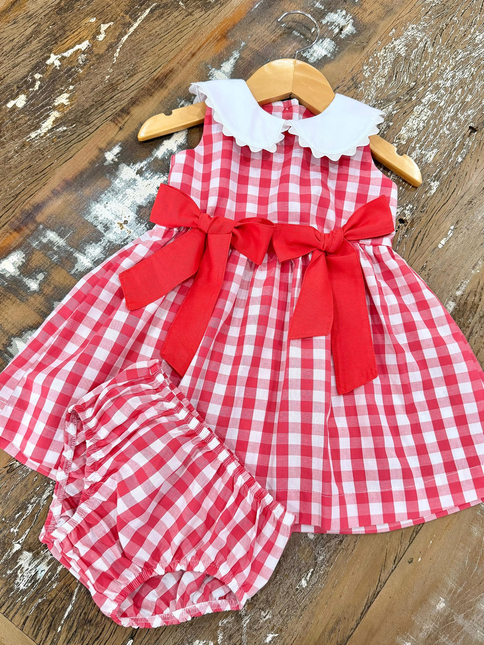 Vestido Flora confeccionado em tricoline xadrez Vichy 100% algodão, laços em contraste com a peça também em tricoline 100% algodão, golas em fustão 100% algodão com detalhe de gregas de poliéster. Um charme!